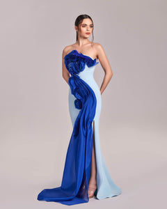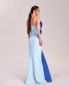 An elegant ice blue gown enhanced with royal blue organza, crystal inserts, and feather details, perfect for making a statement at any event.